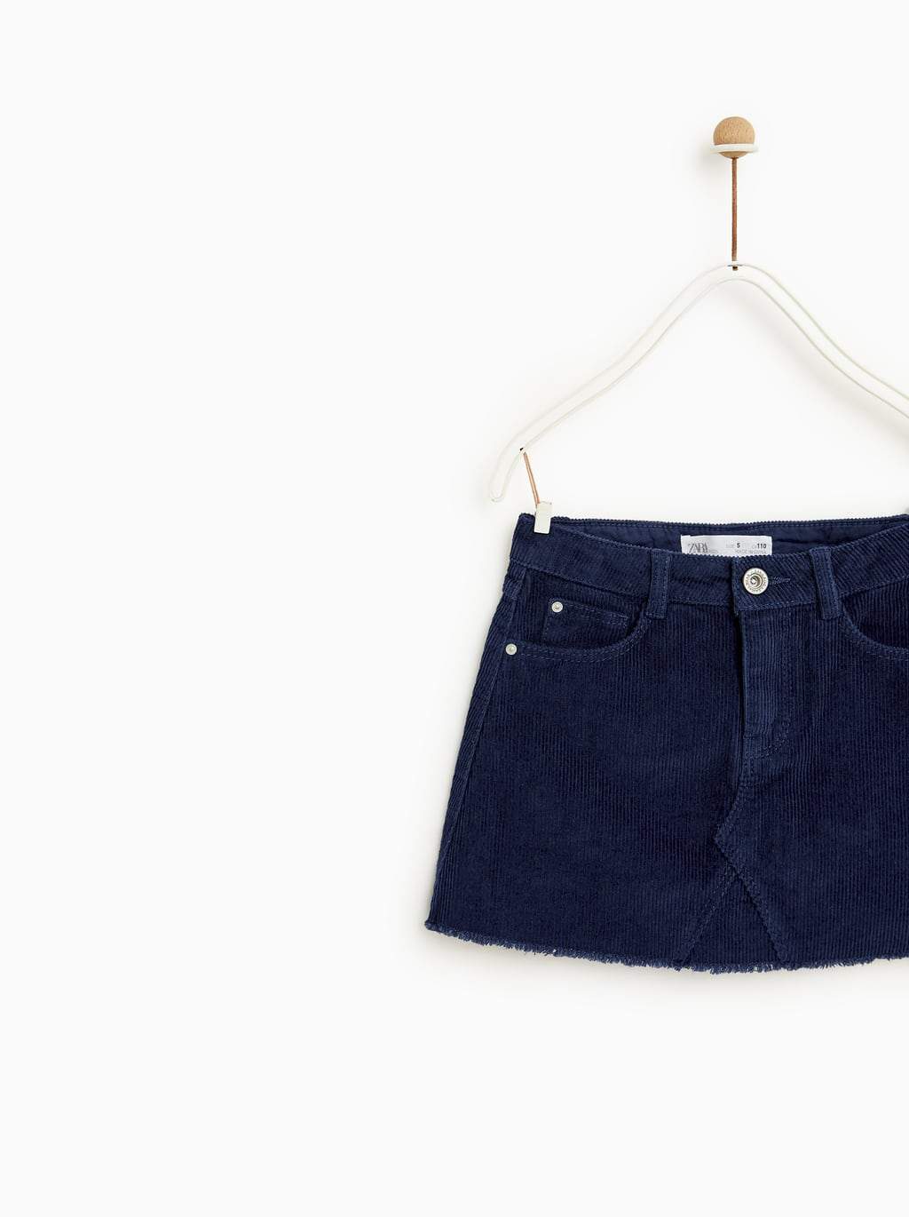 Corduroy skirt with an adjustable interior waistband and front button fastening. Featuring front pockets and a frayed hem.