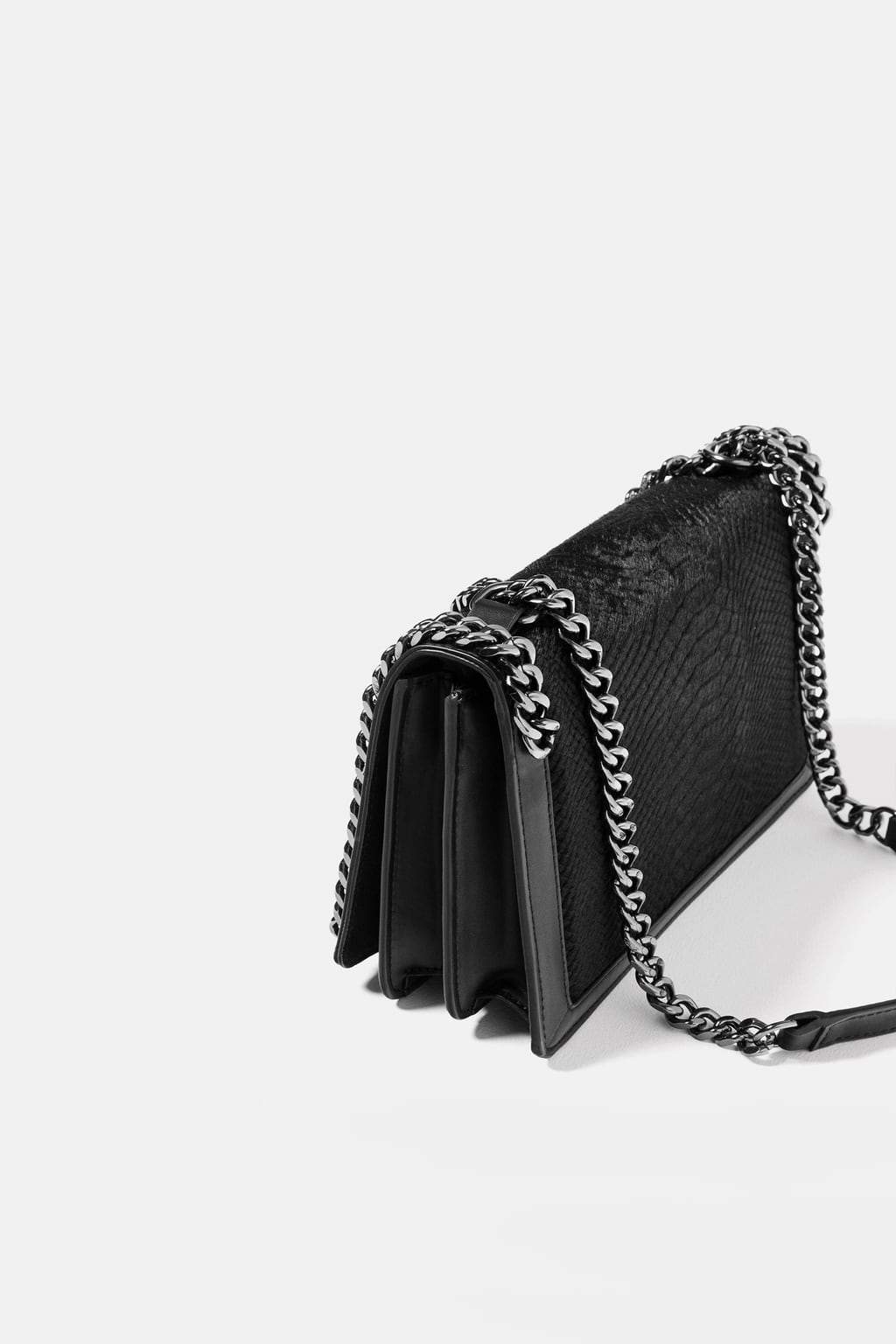 Embossed black bag. Reptile-texture leather flap and faux-fur finish. Chain detail around the edge. Silver-toned hardware. Adjustable shoulder strap. Lining with two compartments and a pocket. Magnet fastening.